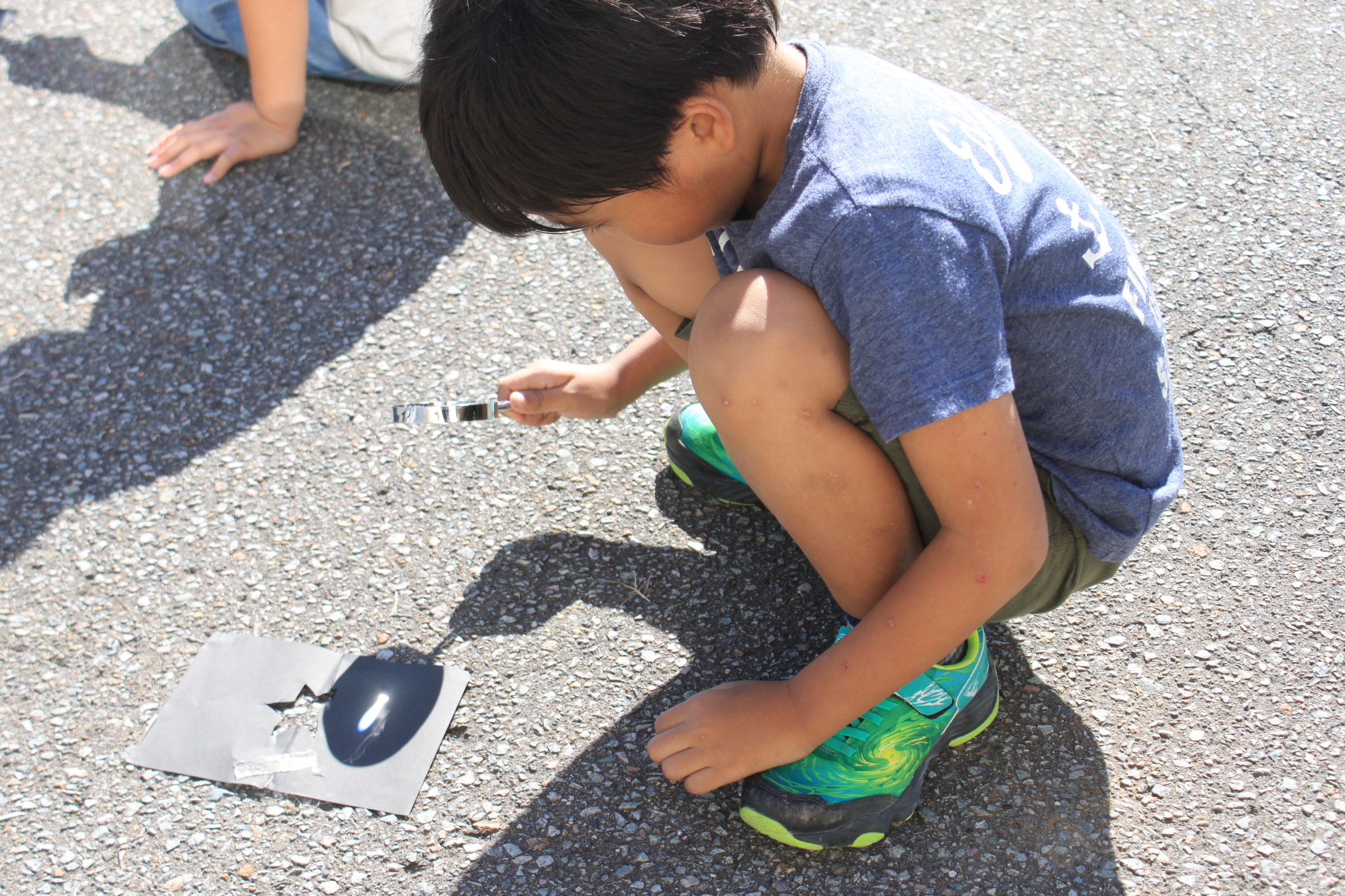 虫眼鏡を使って日光を集め、黒紙を熱しました。