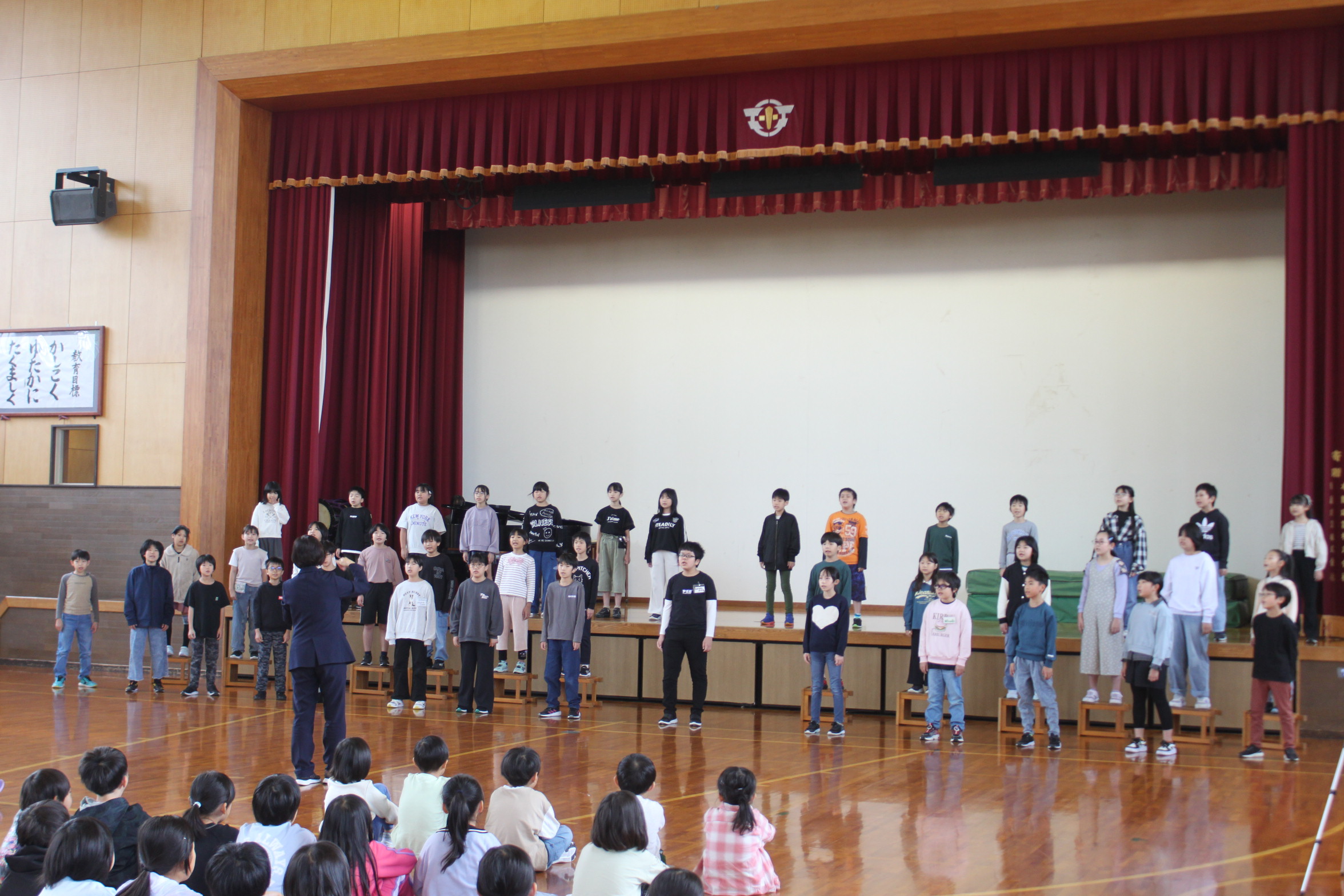 来週の市音楽祭に向けて練習している4・5年生が、全校の前で合唱を披露してくれました。抒情的な歌詞に気持ちがのって、一人一人に熱がこもっている様子が感じられました。来週の本番に向けて、よりよい合唱を目指していきます。