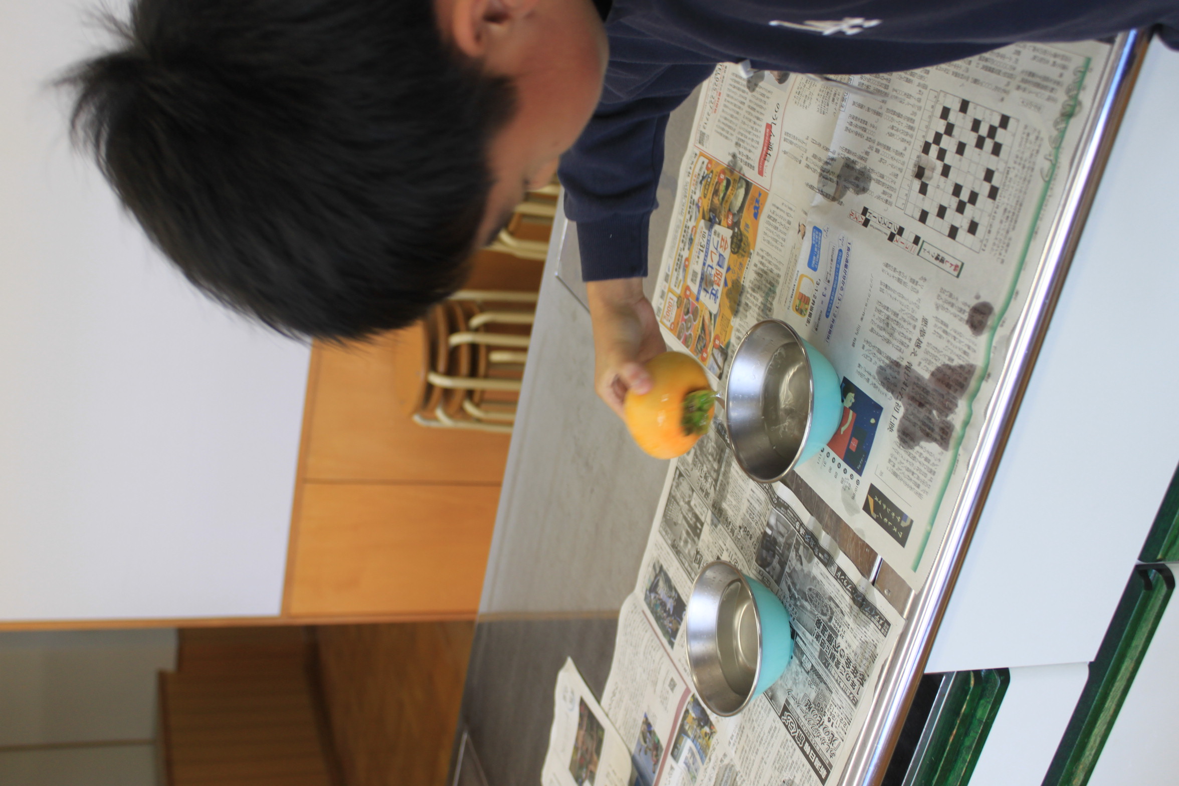 5年生は、先日収穫した柿のさわし作業を行いました。へたの部分をエタノールに付けています。