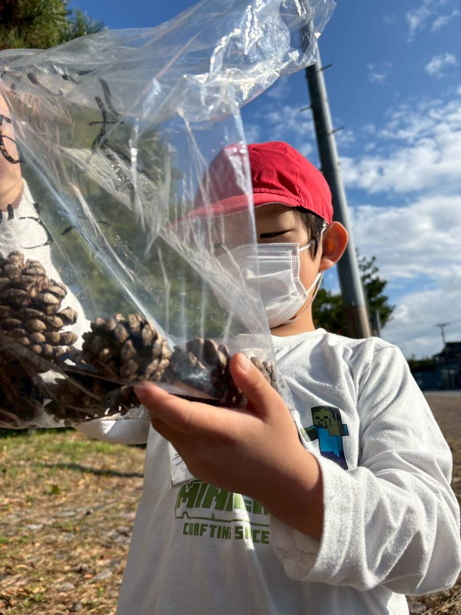秋晴れの中で、全員揃って、いい活動ができました!拾ってきたドングリや松ぼっくり、落ち葉は、作品作りに使います。そちらもお楽しみに~