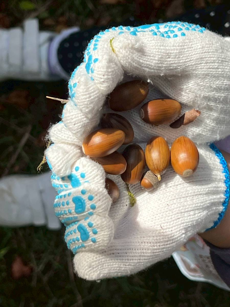 1年生が小木港向いの小路で、ドングリ拾いをしてきました!
