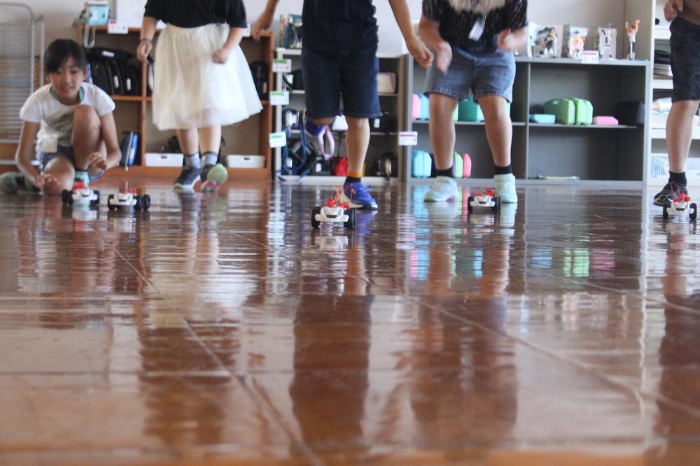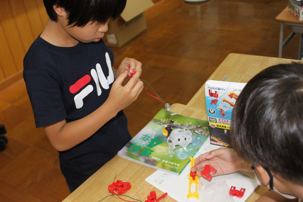 回路(直列、並列)をつくって電流を流し、プロペラを飛ばしたり、豆電球を付けたりしてきました。今日は、モーターカーをつくりました!これからもっと遊んで、電気のはたらきを学んでいきます!