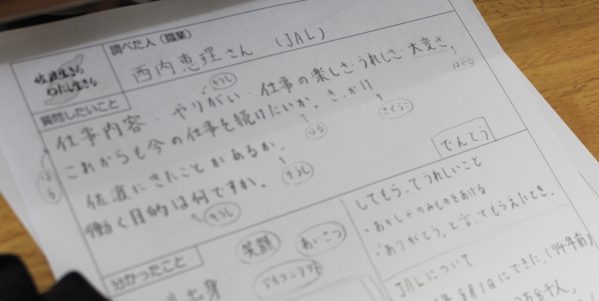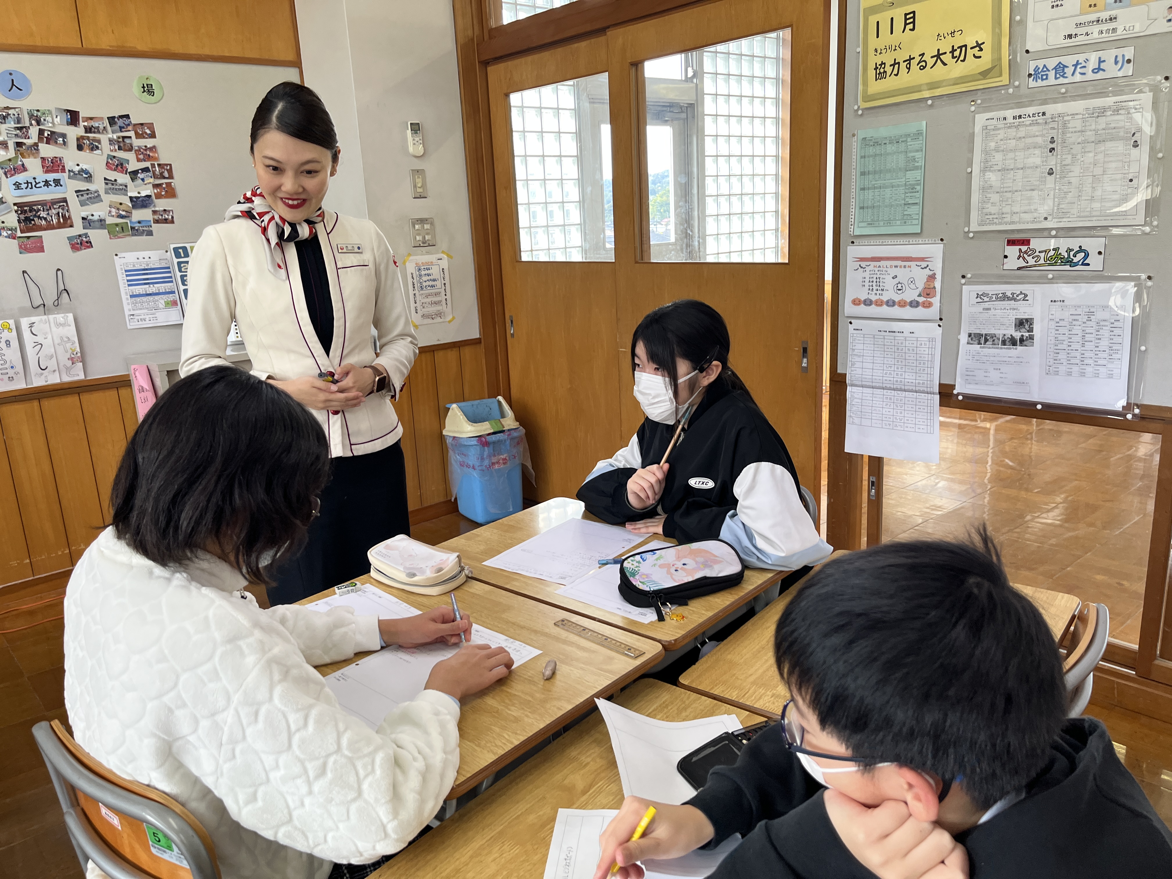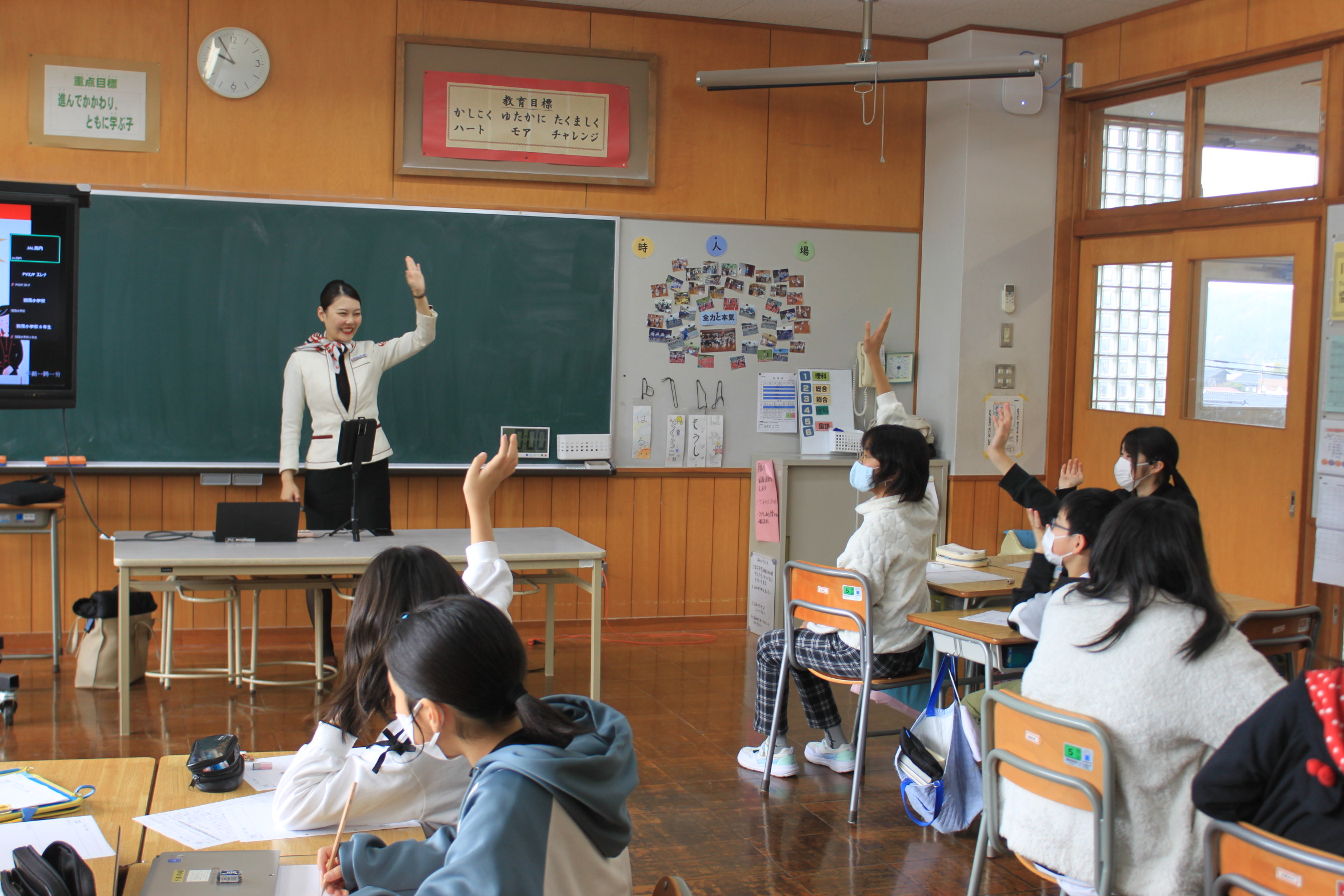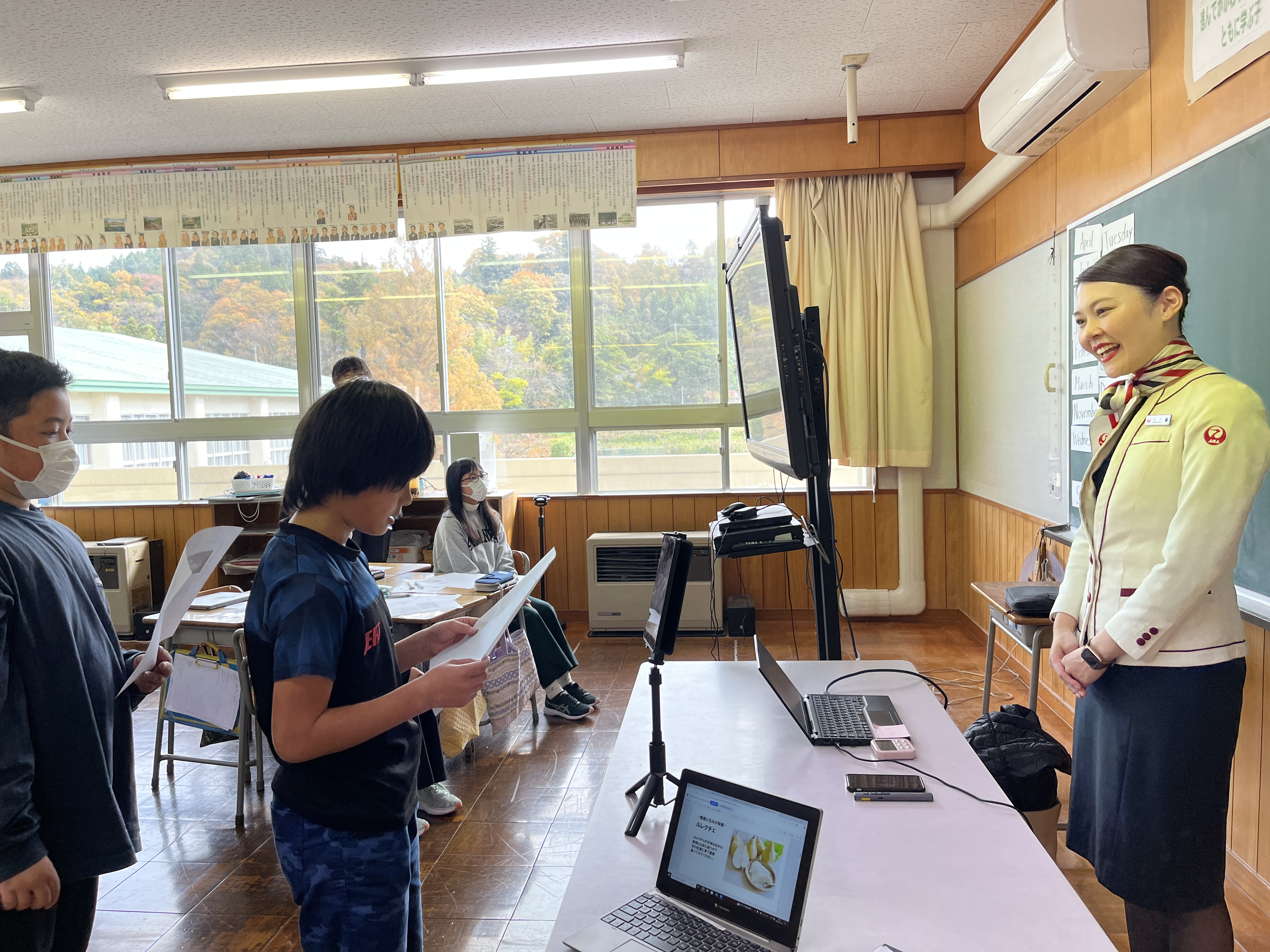 6年生は、総合学習(キャリア教育)の一環として、CAさんのお仕事を学んだり、JALの方に佐渡や羽茂を紹介したりしました!