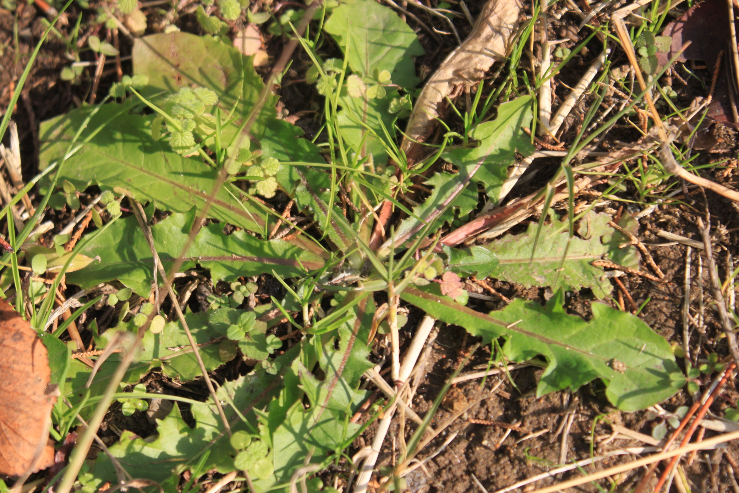 次は、タンポポです。地面に接するように放射線状に葉を広げています。