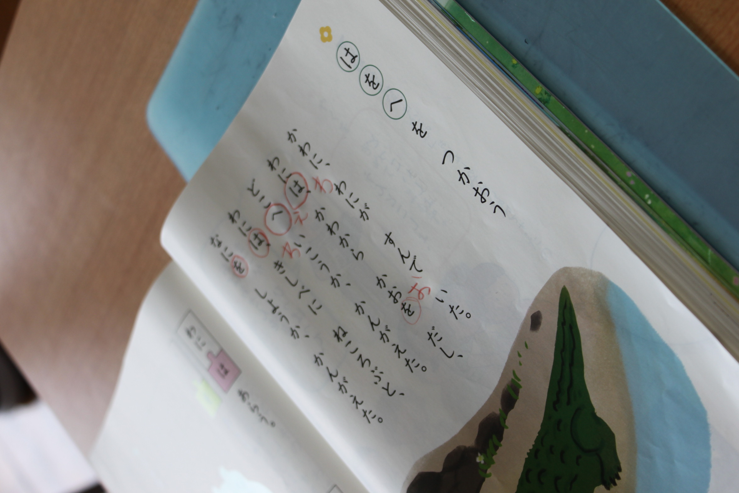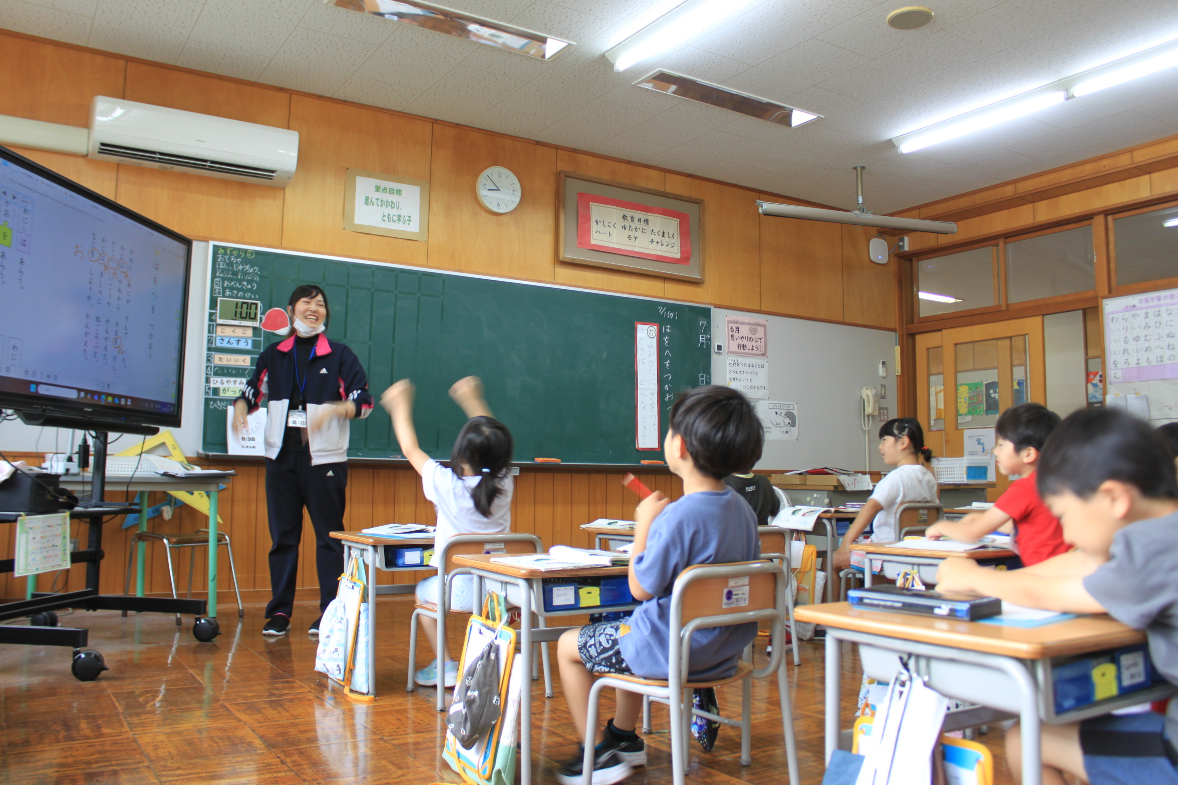 言葉を身体的に学んでいる1年生。1年生の発達特性や言葉遊びの要素を生かした授業でした。遊んでいる?ように見えるけど、子どもと教師で対話しながら、ちゃんと、は・を・への使い方に気付きました。
