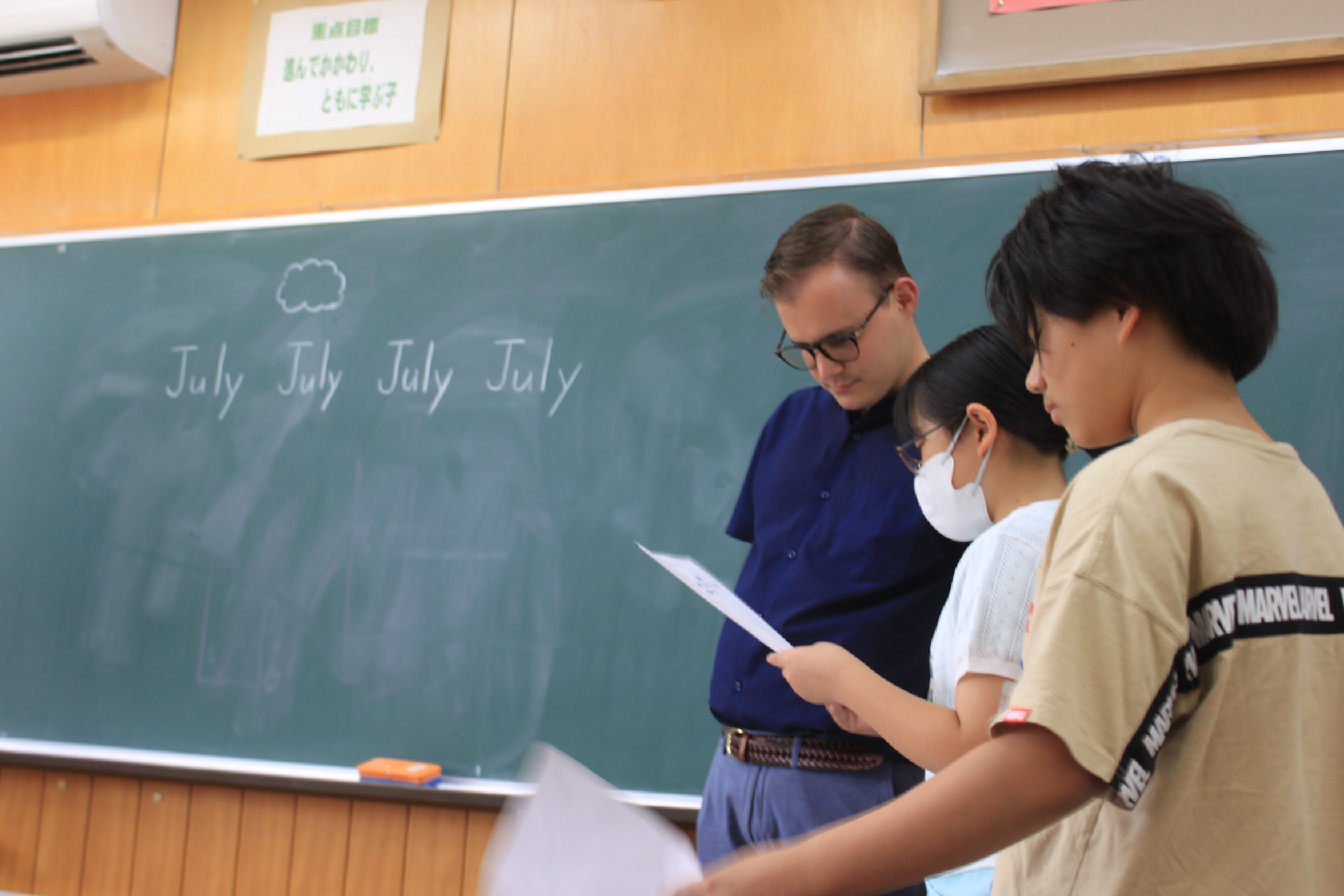 外国語科(5・6年)や外国語活動(3・4年)では、ALTのマット先生とコミュニケーションを取っています。今日は、「This is ~.」「I ike ~.」「I have ~.」の構文で一人ずつ話してみました!