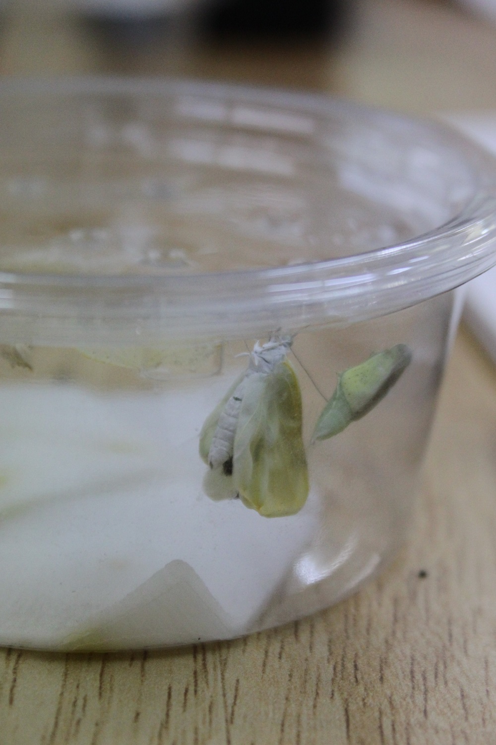 職員室に入ると、子どもと大事に育てていたアオムシが蛹から羽化していることに気付きました!!