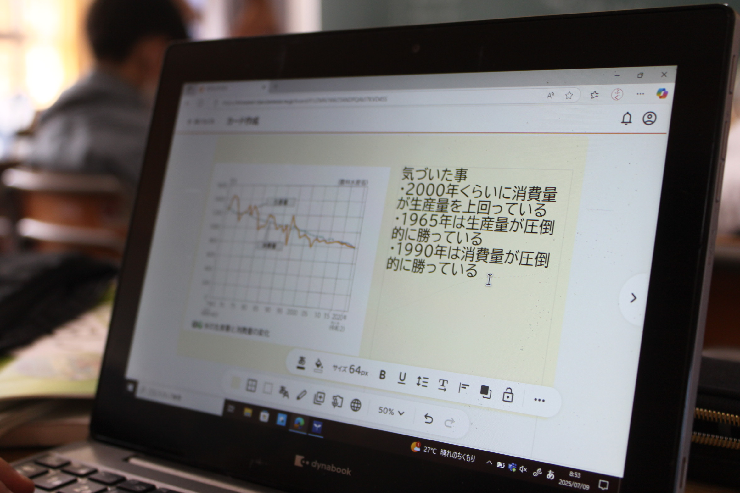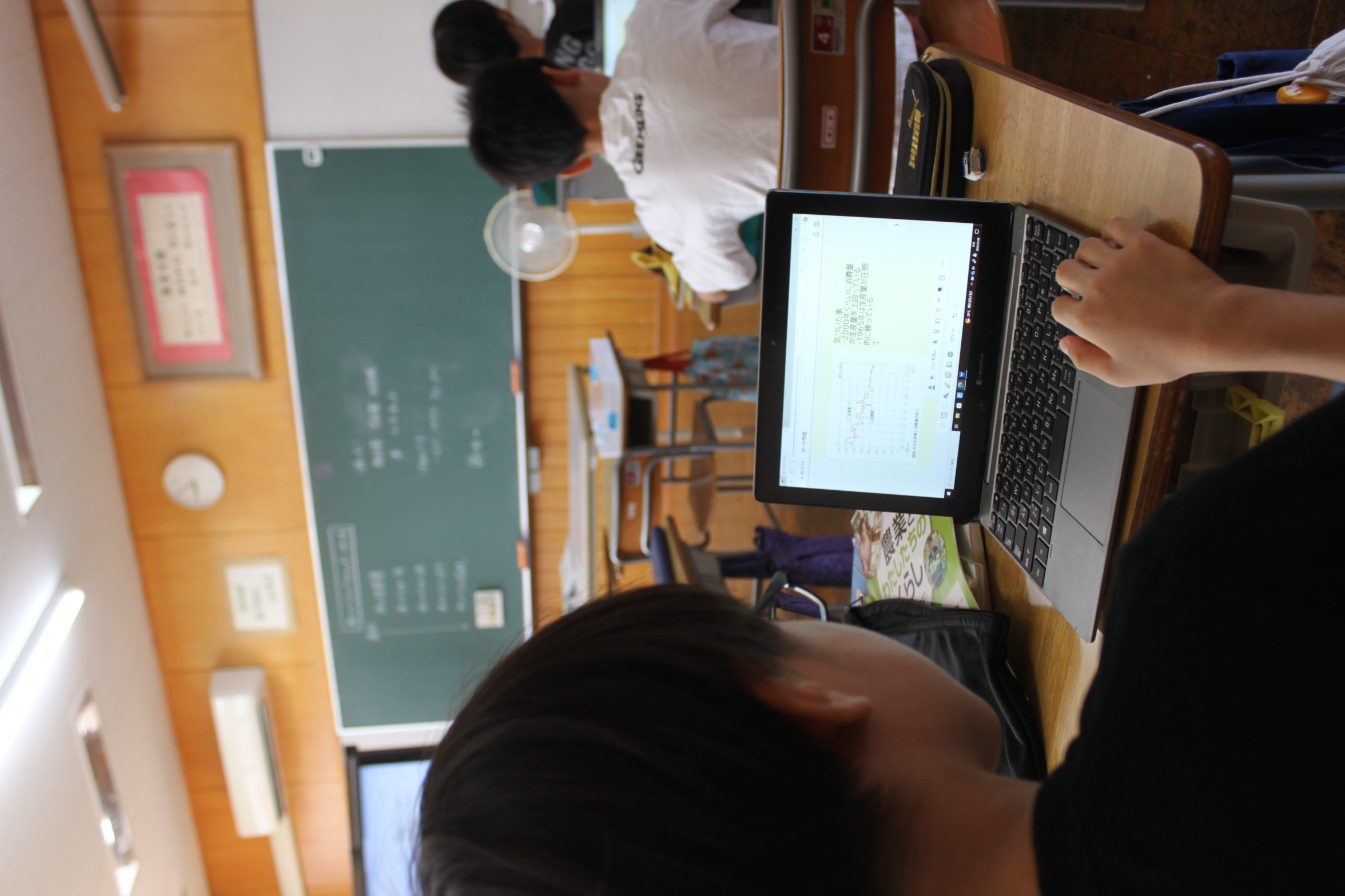 教科書から、米の生産量と消費量のグラフを一人一台端末に配信し、そこから分かることや考えたこと、調べたことを端末にまとめました。もちろん、子どもが文章を打ち込んでいます。