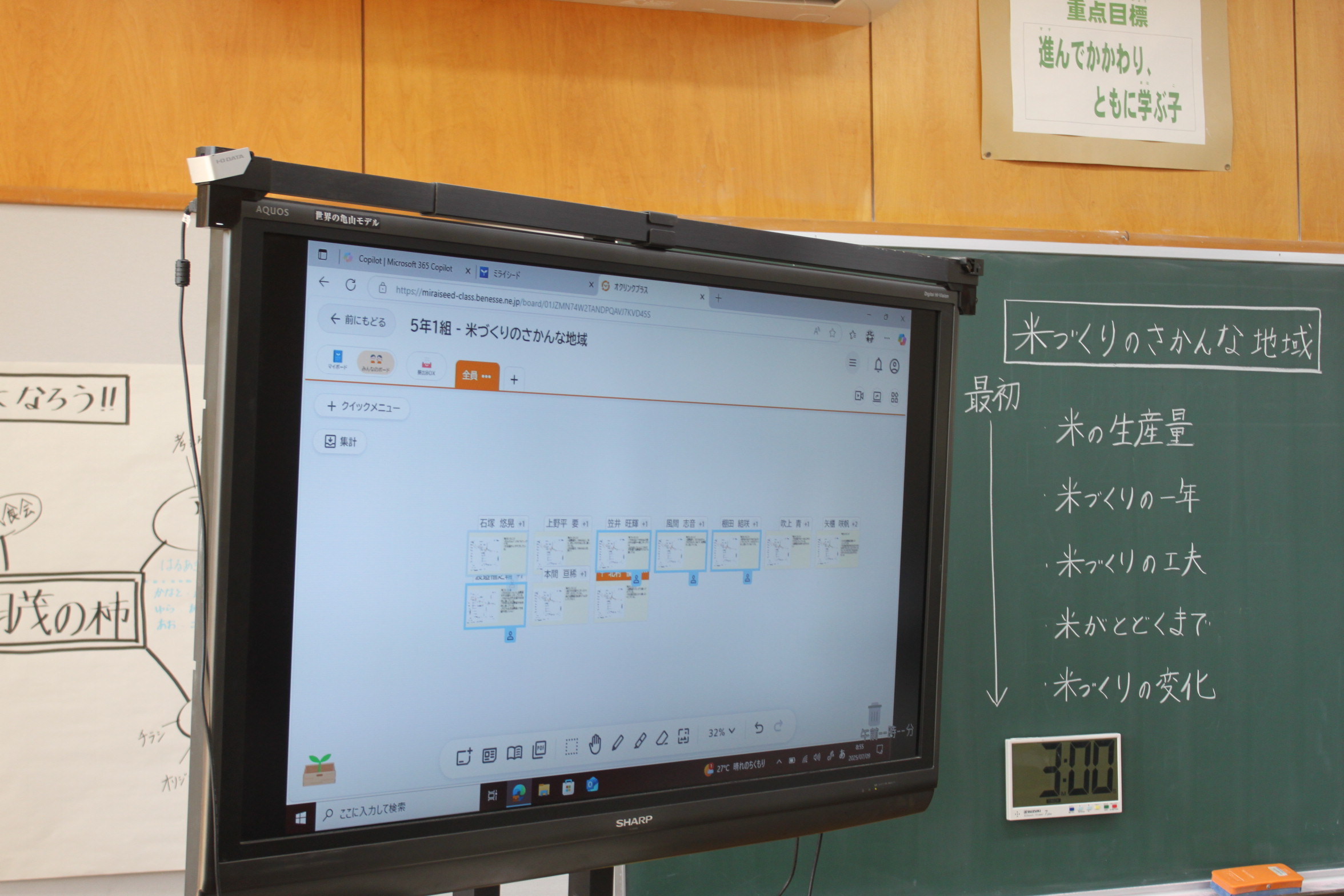5年生の社会では、米作りのさかんな地域を学び、米作りの今後の課題について考えています。