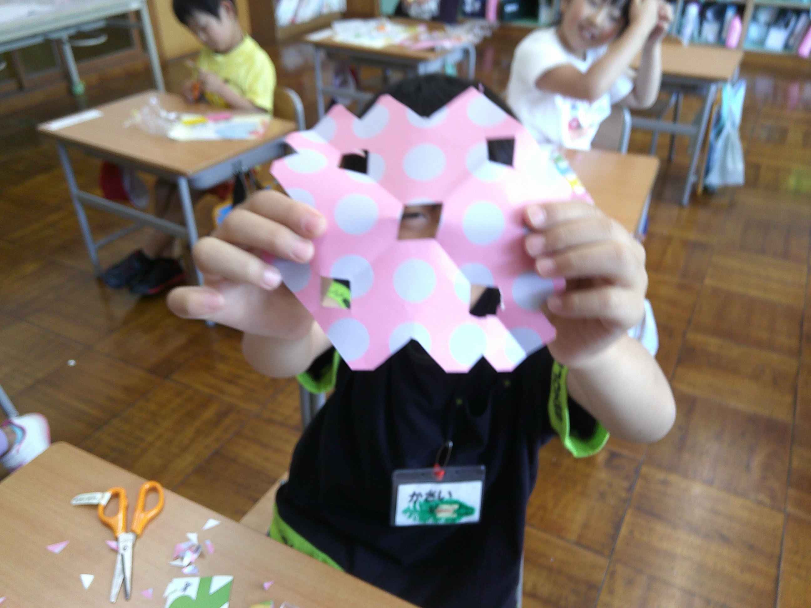 1年生の図工です。はさみ(道具)を使って、新奇な模様や自分だけの世界を生み出しています。